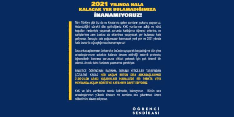 Öğrenci Sendikası’nın sanal medya üzerinden yaptığı açıklamada, ev kiralarına gelen zamların şokunu yaşadıklarını belirterek, “Yetersizliğini sürekli dile getirdiğimiz KYK yurtlarının azlığı ve kötü koşulları nedeniyle yaşamak zorunda kaldığımız öğrenci evlerine, ev sahiplerinin zam baskısı da eklenince yaşayacak yer bulamaz hale geliyoruz. Sonuçta pek çoğumuzun barınacak yeri yok ve 2021 yılında hala bununla uğraştığımıza inanamıyoruz. Sıra arkadaşlarımızın üniversite önünde uyuyarak başlattığı ve dün yine arkadaşlarımızın sokakta kalarak devam ettirdiği anlamlı protesto öğrencilerin barınma sorununa dikkat çekmek için çok önemli bir adımdı. Ancak daha fazlasını yapmamız gerekiyor. Binlerce öğrencinin barınma sorunu yetkililer tarafından çözülene kadar her akşam bütün sıra arkadaşlarımızı 21.00 -24.00 arası yaşadıkları mahallede bir parkta ya da meydanda akşam nöbetine kalmaya davet ediyoruz. KYK ve kira zamlarına sessiz kalmadık, kalmıyoruz. Bütün sıra arkadaşlarımızı yüksek kiralara ve zamlara ses çıkarmak üzere nöbetimize davet ediyoruz” ifadeleri kullanıldı.