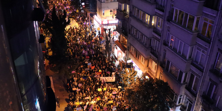 Cihangir, Karaköy ve İstiklal Caddesi’nden Sıraselviler’e yürüyen kadınlar ellerinde düdük,bayrak ve dövizlerle yürüyor. Kadınlar ellerinde, “Barış da bahar da kadınlarla gelecek”, “İsyan”, “Erkeklere makul bir mücadele borcumuzyok”, “Fail erkek hasta değil, ataerkinin sağlıklı oğludur” dövizleri ve “Jin jiyan azadî”, “Kadın, yaşam, özgürlük” sloganları ile caddeye farklı noktalardan yürümeye başladı.