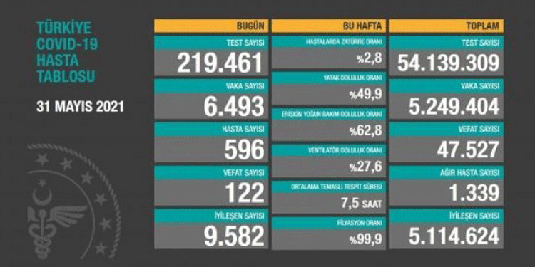 Sağlık Bakanlığı, koronavirüs (Covid-19) günlük hasta tablosunu paylaştı. Verilere göre, Türkiye’de koronavirüs nedeniyle son 24 saatte 122 kişi daha hayatını kaybetti, 596 yeni hasta dahil olmak üzere 6493 yeni vaka tespit edildi.