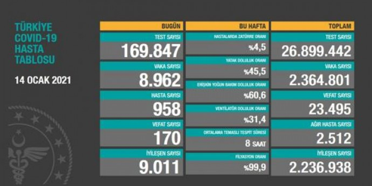 Tabloya göre Türkiye’de Koronavirüs nedeniyle 170 kişi daha hayatını kaybetti, 8 bin 962 yeni vaka tespit edildi. Böylece pandemiden dolayı yaşamını yitiren toplam kişi sayısı 23 bin 495’e, vaka sayısı ise 2 milyon 364 bin 801’e yükseldi.