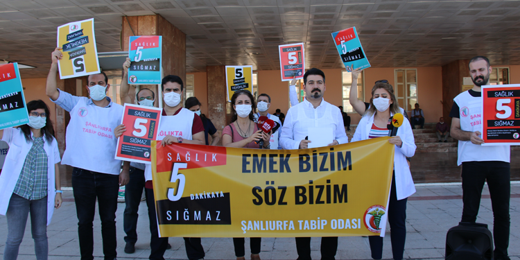 Merkezi Hekim Randevu Sistemi’ndeki (MHRS) randevu aralığının Sağlık Bakanlığı tarafından 5 dakikaya düşürülmesine ilişkin Urfa Tabip Odası açıklama yaptı. Sağlık ve Sosyal Hizmetler Sendikası (SES) üyeleri de açıklamaya destek verdi. Mehmet Akif İnan Eğitim Araştırma Hastanesi önünde yapılan açıklamada “Sağlık 5 dakikaya sığmaz emek bizim söz bizim” pankartı açıldı.
