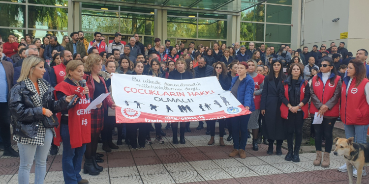 Genel Hizmetler İşçileri Sendikası (Genel-İş) İzmir Kadın Komisyonu, cemaat ve tarikatlarda gerçekleşen çocuk istismarına ilişkin Büyükşehir Belediyesi önünde basın açıklaması düzenledi. “Bu ülkede dokunulmazlık milletvekillerin değil çocukların hakkı olmalı” pankartının açıldığı açıklamada, sık sık, “İstismar suçtur aklanamaz”, “Çocuk gelinlere sen de dur de”, “AKP elini çocuklardan çek” sloganları atıldı.