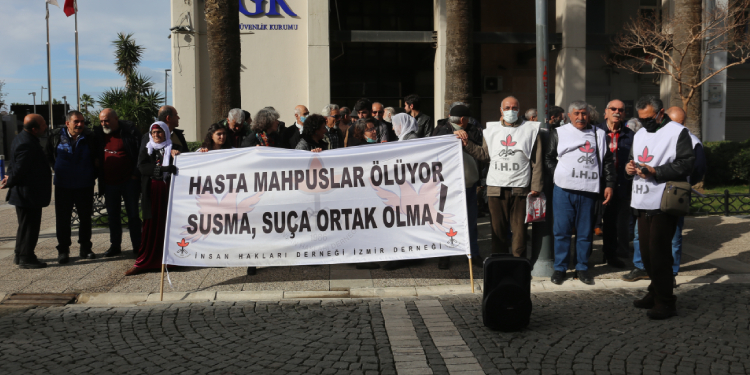 İnsan Hakları Derneği (İHD) İzmir Şubesi, hasta tutukluların durumuna dikkat çekmek için düzenlediği 268’inci eylemini Konak eski Sümerbank gerçekleştirdi. “Susma suça ortak olma, ölüyorlar” pankartının açıldığı açıklamaya Halkların Demokratik Partisi (HDP) ve siyasi parti temsilcileri katıldı. Eylemde konuşan İHD İzmir Yönetim Kurulu Üyesi Caner Canlı, Kırıklar F Tipi Cezaevi’nde bulunan 71 yaşındaki Mehmet Sait Yıldırım’ın durumunu anlattı.