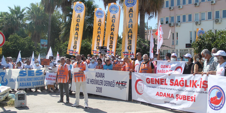 Adana’da Aile Hekimleri Derneği (AAHD), yönetmeliği Adana İl Sağlık Müdürlüğü önünde yaptıkları açıklamayla protesto etti. Açıklamaya, SES Adana Şubesi ve Adana Tabip Odası (ATO) üyeleri de destek verdi. Pandemide ödendiği söylenen ödemelerin kendilerine verilmediğini anlatan AAHD Başkanı Dr. Kadir Can Tuncel, personelden 500, aile hekimlerinden bin 500 TL kesilmesini ön gören yönetmeliği kabul etmediklerini ifade etti. Pandemi sürecinde aile hekimlerinin kronik hastalık, dinlenme, izin hakkı demeden sahada olduğunu dile getiren Tuncel, “Zor şartlar altında bizler görevimizi yaparken, Ankara’da 3-4 bürokrat ortalığı karıştırmak adına sayın Sağlık Bakanı’nı ‘aile hekimlerine para veriyoruz. Onların işlerini kolaylaştırıyoruz’ yalanını söyleyerek, almadığımız ve asla da alamayacağımız ücretleri de içeren, yerine getirilemez şartlarla dolu. Ağır cezalar içeren baskı ve zulüm yönetmeliğini çıkarmışlardır” dedi.
