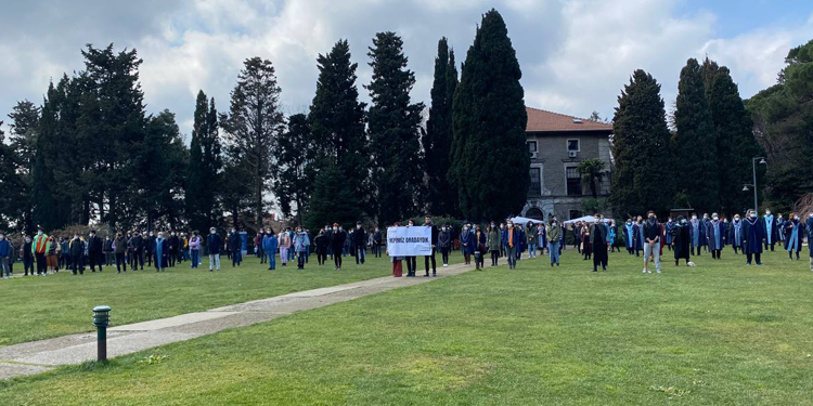 AKP’li Cumhurbaşkanı Erdoğan tarafından Boğaziçi Üniversitesi’ne atanan kayyım rektör Melih Bulu’ya karşı akademisyen ve öğrencilerin başlattığı eylemler dünya genelinde yoğun destekler ile sürüyor. Akademisyenlerin rektörlüğe sırt dönme eylemi bugün de devam ederken, öğrenciler de eyleme dahil oldu. Güney Kampüsü’nde bir araya gelen akademisyen ve öğrenciler rektörlük binasına sırtlarına dönerek, kayyım rektörü istifaya çağırdı.