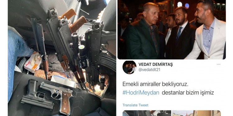 AKP’li Demirtaş, Twitter hesabından paylaştığı fotoğrafta, araç içerisinde 3 adet kalaşnikof, iki adet tabanca, bir adet taarruz tüfeği ve çok sayıda taarruz dürbünleri görülüyor. Söz konusu paylaşımda Demirtaş, “Emekli amiraller bekliyoruz. Hodri meydan. Destanlar bizim işimiz” diye yazdı.