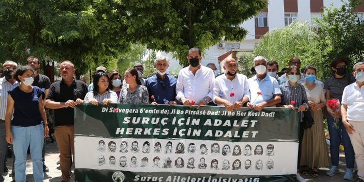 Katliamda yaşamını yitirenlerin fotoğraflarının olduğu pankartı açan kitle, yaşamını yitirenleri saygı duruşuyla andı. Ardından kitle, “Suruç için adalet herkes için adalet”, “Şehid namirin” ve “Suruç’un hesabı sorulacak” sloganları atıldı.