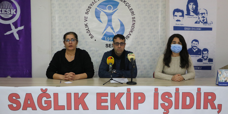 Amed Sağlık Platformu, yarın yapacakları bir günlük iş bırakma grevine ilişkin Sağlık ve Sosyal Hizmet Emekçileri Sendikası (SES) Diyarbakır Şubesi binasında açıklama yaptı. “Sağlık ekip işidir, bizi ayrıştıramazsınız” pankartının açıldığı açıklamaya SES Eş Genel Başkanı Selma Atabey, Diyarbakır Tabip Odası Başkanı Elif Turan ve SES Diyarbakır Şube Eşbaşkanı Şiyar Güldiken katıldı.