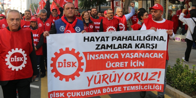 DİSK’e bağlı Genel-İş Sendikası Mersin Şube Başkanı Kemal Göksoy, Asgari Ücret Tespit Komisyonu’nda 5’i hükümet, 5’i patron ve bir diğer 5 kişinin de iktidar yanlısı sendika temsilcilerinden oluştuğunu, emekçi halkları temsil eden bir yapının veya kurumun olmadığını ifade ederek, “Bu komisyon, işçiye ‘hükümet ne dersen onu yaparız’ diyor” şeklinde konuştu. Göksoy, her geçen gün yükselen enflasyon oranlarına karşı DİSK olarak, asgari ücret tutarının her üç ayda bir yenilenmesi gerektiği yönünde işçiler adına taleplerinin olduğunu hatırlattı. Cumhurbaşkanı Erdoğan’ın asgari ücrete dair geçtiğimiz günlerde sarf ettiği, “Asgari ücret artışı zaten biliyorsunuz yıl içinde bir kezdir. Bir kez verilecek zamla bu iş biter. Biz vatandaşımızı bugüne kadar enflasyona ezdirmedik ve ezdirmeyiz” söylemine işaret eden Göksoy, “Bu tablonun nedeni AKP iktidarıdır” diye yanıt verdi.