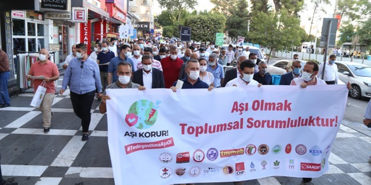 Sağlık Bakanlığı tarafından yayımlanan koronavirüs (Kovid-19) risk haritasında çok yüksek riskli il (kırmızı) kategorisindeki 6 ilden biri olan Urfa’da, vaka sayıları bine yaklaştı. Her gün ortalama 8 kişinin koronadan kaynaklı yaşamını yitirdiği kentte, pandemi servisleri ve yoğun bakım ünitelerinde yer kalmadı. Daha önce kapatılan pandemi servislerinin tekrar açılacağı konuşulan kent, aşılamada ise son sırada yer alıyor. Salgın başladığından bu yana Sağlık Bakanlığı, Valilik ve İl Sağlık Müdürlüğü’ne çağrıda bulunan demokratik kitle örgütleri, kampanyalara dahil edilmiyor. Buna rağmen 24 meslek ve sivil toplum örgütü ve siyasi parti Urfa Tabip Odası ve Sağlık ve Sosyal Hizmet Emekçileri (SES) Urfa Şubesi’nin çağrısıyla 12 Ağustos 2021 tarihinde bir araya gelerek “Aşı seferberliği” başlattı.