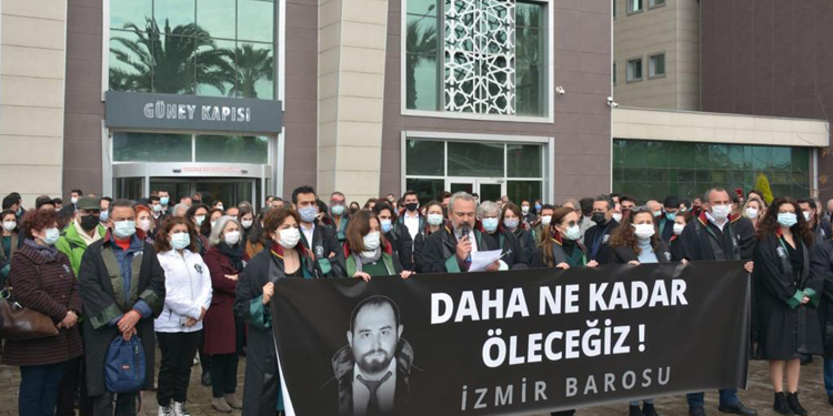 avukat Ersin Arslan’ın icra işlemleri için gittiği evde öldürülmesine ilişkin İzmir Barosu, Bölge İdare Mahkemesi önünde basın açıklaması yaptı. Avukat Arslan’ın fotoğrafının da yer aldığı “Daha ne kadar öleceğiz” pankartı arkasında bir araya gelen avukatlar adına açıklamayı İzmir Baro Başkanı Özkan Yücel yaptı.