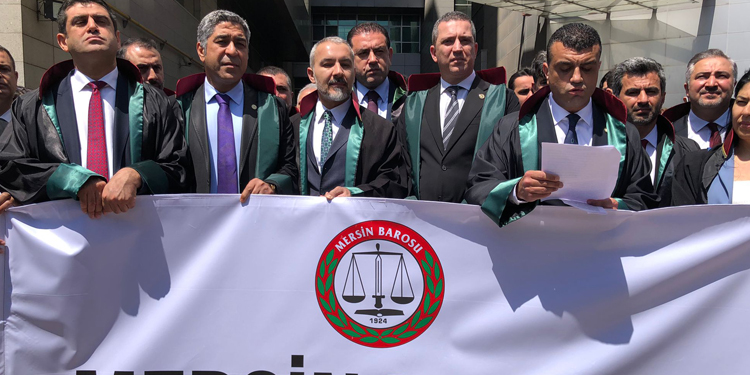 Mersin Barosu, 18 Şubat’ta adliye bahçesinde basın açıklaması yapmak isterken polis tarafından darp edilen ve “2911 sayılı Toplantı ve Gösteri Yürüyüşü Kanunu’na muhalefet etmek”, “Görevi yaptırmamak için direnme” ve “Görevli memura mukavemet” iddiasıyla üyeleri hakkında soruşturma başlatılmasını protesto etti. Mersin Adliyesi bahçesinde yapılan açıklamada, Bursa’da gardiyanları taşıyan araçta yaşanan patlama gerekçesiyle “güvenlik zafiyeti oluşacak” denilerek gazetecilerin ekipmanları içeriye alınmadı. Uzun süre adliye kapısında bekleyen gazeteciler, ekipmanlarını, emanete bırakarak, cep telefonuyla çekim yaptı. “Mersin Barosu” yazılan pankartın açıldığı açıklamaya Türkiye Barolar Birliği (TBB) Başkanı R. Erinç Sağkan, TBB yönetim kurulu üyeleri, Özgürlük İçin Hukukçular Derneği (ÖHD) Eş Genel Başkanları İlknur Alaca ve Bünyamin Şeker ile birçok baro başkanı ve avukat katıldı.