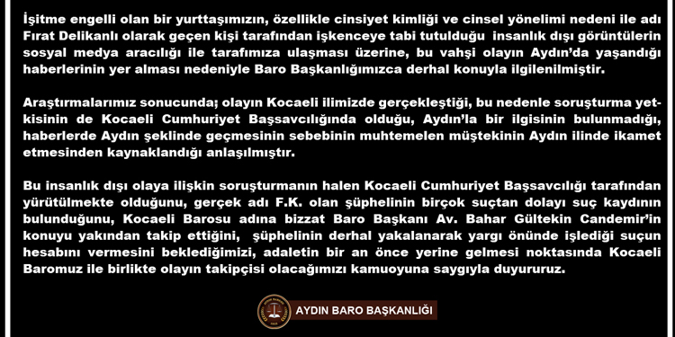Barodan yapılan açıklama şöyle: “İşitme engelli olan bir yurttaşımızın özellikle cinsiyet kimliği ve cinsel yönelimi nedeniyle adı Fırat Delikanlı olarak geçen kişi tarafından işkenceye tabi tutulduğu insanlık dışı görüntülerin sosyal medya aracılığıyla tarafımıza ulaşması üzerine, bu vahşi olayın Aydın’da yaşandığı haberleri nedeniyle Baro Başkanlığımız derhal konuyla ilgilenilmiştir. Araştırmalarımız sonucunda olayın Kocaeli ilimizde gerçekleştiği ve bu nedenle soruşturma yetkisinin de Koceli Cumhuriyet Başsavcılığında olduğu, Aydın’la bir ilgilisinin bulunmadığı, haberlerde Aydın şeklinde geçmesinin sebebinin muhtemelen müştekinin Aydın ilinde ikamet etmesinden kaynaklandığı anlaşılmıştır.
