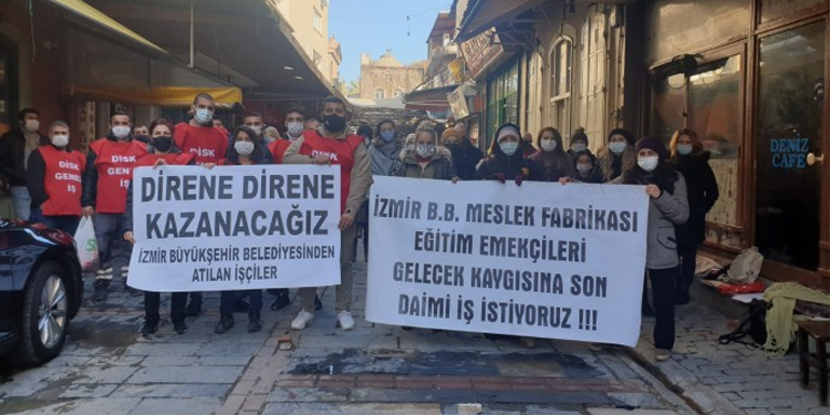 İzmir Büyükşehir Belediyesi İZENERJİ ve İZELMAN’da çalışan ve Ekim ayında güvenlik soruşturması gerekçesi ile işten çıkartılan işçiler, İzmir Konak’taki Başkanlık binası önünde eğitmenlerin ve emekçilerin taşeron sisteme karşı sürdürdükleri eylemi ziyaret etti.