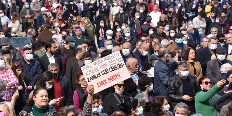 Mersin Emek ve Demokrasi Platformu, emekli, memur ve işçi maaşlarına yapılan zammın, son dönemde elektriğe, suya, doğalgaza ve temel ihtiyaçlara yapılan zamlarla erimesine karşı “Artık yeter geçinemiyoruz” şiarıyla Mersin’in Yenişehir ilçesinde bulunan eski Tevfik Sırrı Gür Stadyumu’nda miting düzenledi. Mitinge katılanlar, 2 farklı arama noktasında aramalardan geçtikten sonra alana girebildi. “İş ekmek özgürlük”, “Krize yoksulluğa feminist isyandayız”, “Tüm ücretlere ek zam yapılsın”, “Halklar barış istiyor” ve “Geçinemiyoruz, artık yeter zamlar geri alınsın” dövizlerini taşıyan halk, zamlara tepki gösterdi. “Sefalete teslim olmayacağız” ve “İnsanca yaşamak istiyoruz” sloganı atan halk, miting öncesi halaya durdu.