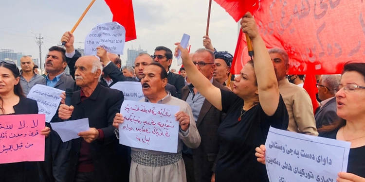 Kürdistan Komünist Partisi ((Hizba Şîu), Kürdistan Emekçi Partisi ve Kürdistan Demokratik Halk Hareketi öncülüğünde bir araya gelen çok sayıda kişi Birleşmiş Milletler (BM) Hewlêr Temsilciliği önünde protesto eylemi gerçekleştirdi. Açıklamaya siyasi parti temsilcilerinin yanı sıra çok sayıda kişi katıldı.