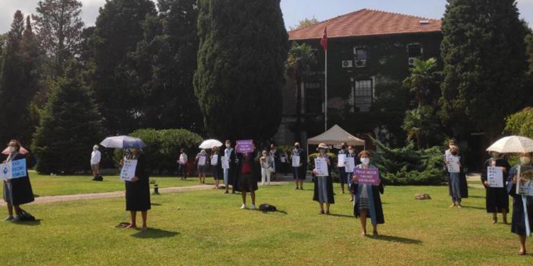 Boğaziçi akademisyenleri, AKP’li Cumhurbaşkanı Tayyip Erdoğan tarafından üniversiteye “kayyım” rektör atamalarına ve atanan “kayyım” rektörlerin meslektaşlarını işten çıkarmasına karşı başlattıkları nöbet eylemini sürdürüyor. Melih Bulu’nun görevden alınarak yerine vekili ve yardımcısı Naci İnci’nin de atanmasını protesto eden akademisyenler, 156’ncı kez rektörlük binasına sırtını döndü. “Kabul Etmiyoruz” ve “Vazgeçmiyoruz” dövizleri taşıyan akademisyenler, rektörlük binası önünde oturma eylemi gerçekleştirdi.