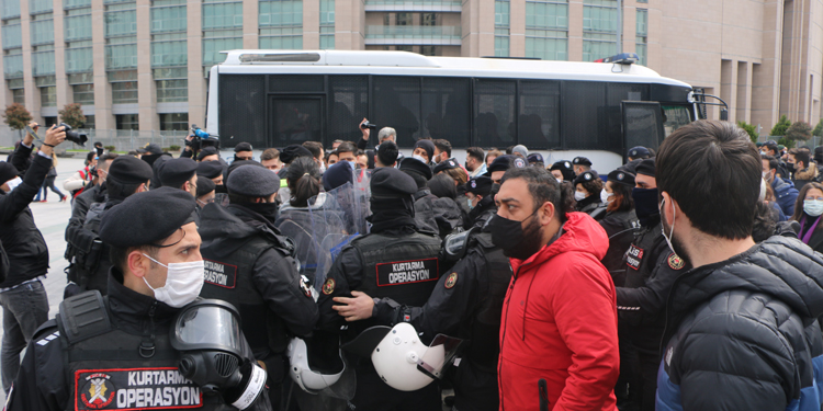 AKP’li Cumhurbaşkanı Erdoğan’ın kararıyla Boğaziçi Üniversitesi’ne atanmış rektör Melih Bulu’ya karşı protestolar sürerken öğrenciler dün polis tarafından gözaltına alınmıştı. Gözaltındaki 24 öğrencinin savcılığa sevk edilmesi beklenirken arkadaşları Çağlayan’da bulunan İstanbul Adliyesi önünde bir araya gelerek açıklama yapmak istedi. Fakat öğrencilerin açıklama yapmasına izin vermeyen polis öğrencilere müdahale etti. 50’ye yakın kişiyi gözaltına alan polis, gazetecilerin makinelerindeki görüntüleri de sildi.