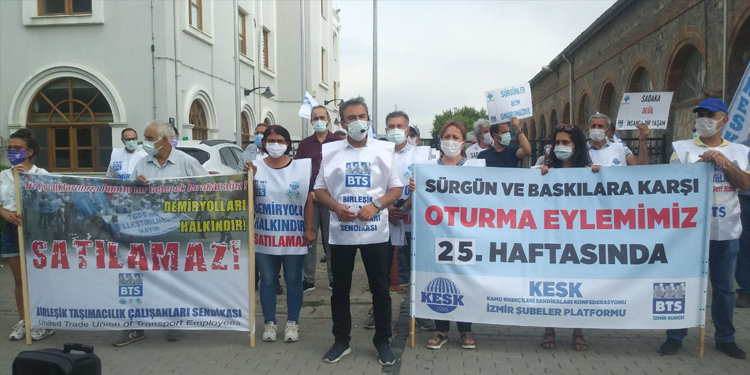 Birleşik Taşımacılık Çalışanları Sendikası (BTS) ve Kamu Emekçileri Sendikası Konfederasyonu (KESK) İzmir Şubeler Platformu Alsancak Gar önünde 25’inci hafta oturma eylemini gerçekleştirdi. “Demiryolları Satılamaz” pankartının açıldığı açıklamada “Sadaka değil, insanca yaşamak”, “Demiryollarında özelleştirme ölüm getirir” dövizleri taşındı. Açıklamaya CHP İzmir milletvekili Özcan Purçu, siyasi partilerin temsilcileri, BTS MYK üyeleri Mustafa Erdoğan, Begüm Özyönüm, KESK Bileşenlerinin yöneticileri ve demiryolu emekçileri katıldı.