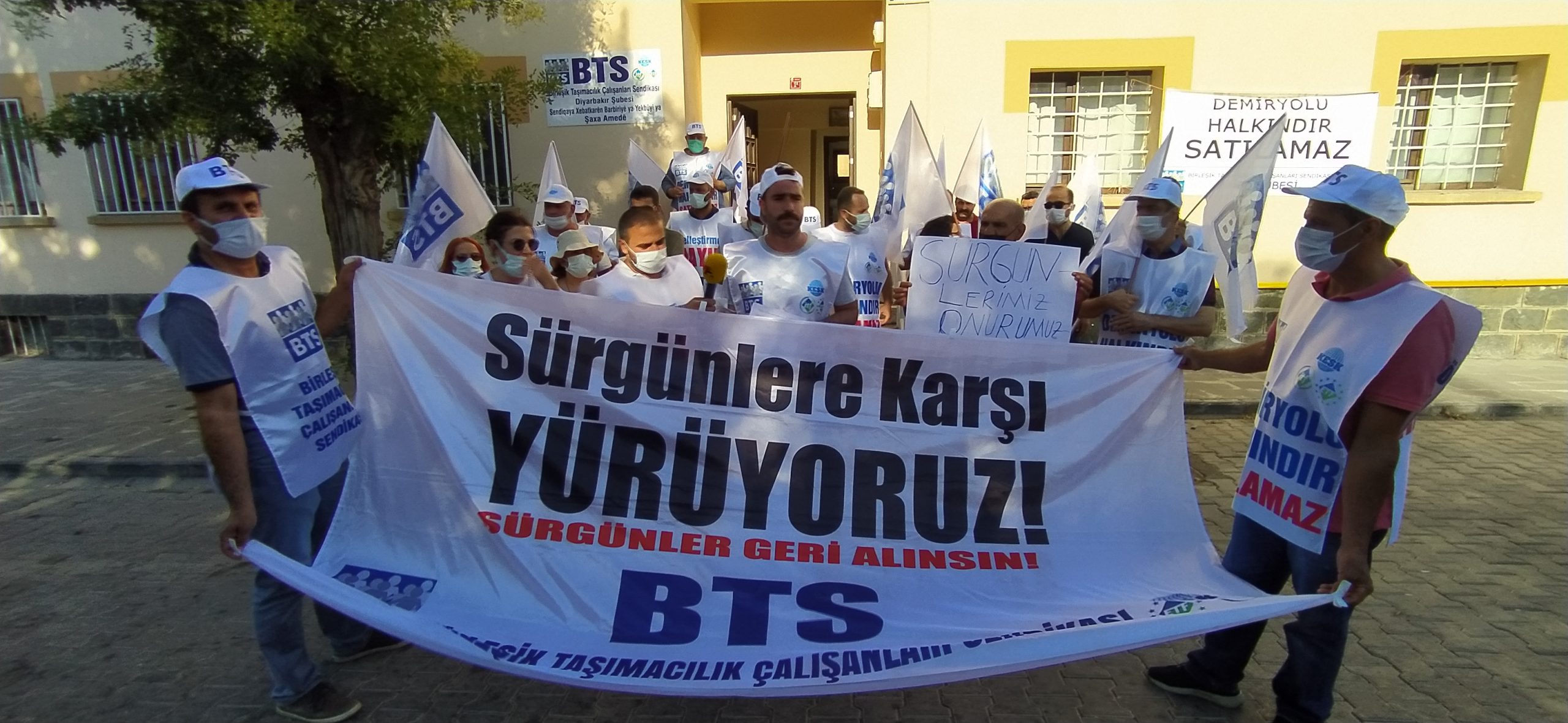 Birleşik Taşımacılık Sendikası (BTS) Diyarbakır Şubesi, sürgün, kamuda unvan ve yükselme sınavlarında yüksek puan alanların mülakatla elenmesine ilişkin şube binası önünde basın açıklaması yaptı. Açıklamada, “Sürgünlere karşı yürüyoruz, sürgünler geri alınsın” pankartı açıldı.