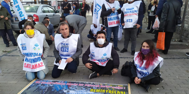 Birleşik Taşımacılık Çalışanları Sendikası’nın (BTS), üyelerinin sürgün edilmesi ve baskıya maruz kalmasına karşı başlattığı oturma nöbeti 45’inci haftasında. Sendika üyeleri, Alsancak Garı önünde bir araya gelerek açıklama yaptı. Açıklamaya Haber-Sen üyeleri, Kamu Emekçileri Sendikaları Konfederasyonu (KESK) bileşenleri ile siyasi parti temsilcileri katıldı.