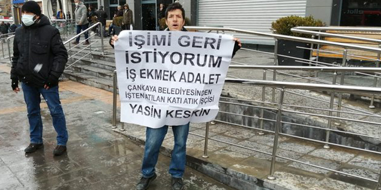 Ankara’da Çankaya Belediyesi’nin “güvenlik soruşturması” gerekçesiyle işine son verdiği Yasin Keskin 39 gündür belediye önüne “işimi geri istiyorum” diyerek eylem yapıyor.
