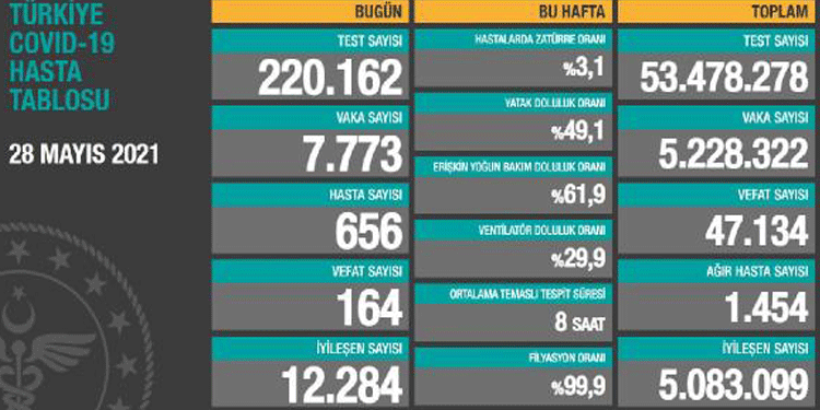 Sağlık Bakanlığı’nca duyurulan “Türkiye Covid-19 Hasta Tablosu”na göre; son 24 saatte yapılan 220.162 testte, 7773 vaka, 656 hasta tespit edildi. Virüs nedeniyle 164 kişi hayatını kaybederken, 12.284 kişi de iyileşti. Bugünkü verilerle toplam test sayısı 53.478.278, toplam vaka sayısı 5.228.322, toplam vefat sayısı 47.134, toplam ağır hasta sayısı 1454, toplam iyileşen sayısı ise 5.083.099 oldu. Tabloda haftalık oranlar ise hastalarda zatürre oranı %3,1, yatak doluluk oranı %49,1, erişkin yoğun bakım doluluk oranı %61,9, solunum cihazına bağlı (ventilatör) doluluk oranı %29,9, ortalama temaslı tespit süresi 8 saat, filyasyon oranı %99,9 şeklinde yer aldı.