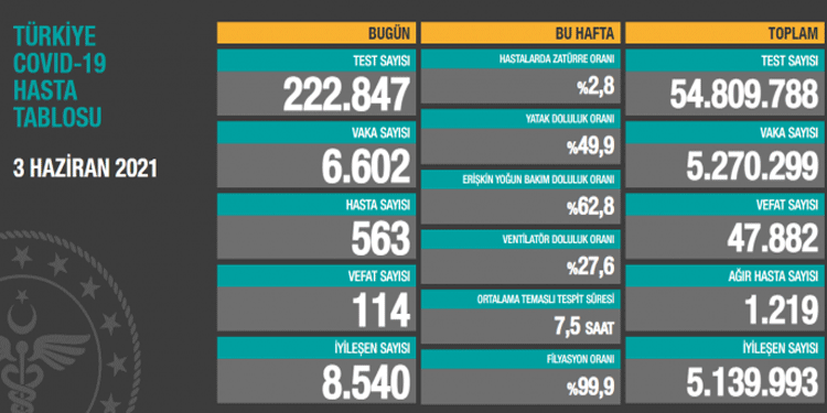 Sağlık Bakanlığı, koronavirüs (Covid-19) günlük hasta tablosunu paylaştı. Verilere göre, Türkiye’de koronavirüs nedeniyle son 24 saatte 114 kişi daha hayatını kaybetti, 563 yeni hasta dahil olmak üzere 6602 yeni vaka tespit edildi.