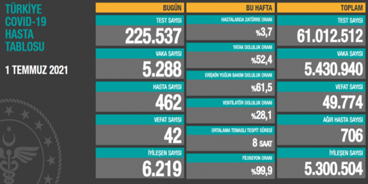 Tabloya göre, 42 kişinin daha hayatını kaybetmesiyle, Covid-19 nedeniyle yaşanan toplam can kaybı sayısı 49.774’e yükseldi. 225.537 testte 5288 kişiye tanı konulmasıyla birlikte toplam vaka sayısı 5.430.940’a yükseldi.