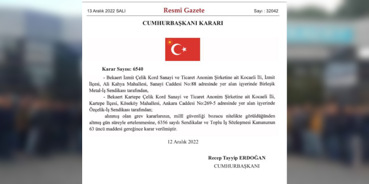 Resmi Gazete’de AKP’li Cumhurbaşkanı Recep Tayyip Erdoğan’ın imzasıyla yayımlanan karara göre, Bekaert İzmit Çelik Kord Sanayi ve Ticaret Anonim Şirketine ait Kocaeli’nin İzmit ilçesindeki işyerinde Birleşik Metal-İş Sendikası tarafından alınan grev kararı ile Bekaert Kartepe Çelik Kord Sanayi ve Ticaret Anonim Şirketine ait Kocaeli’nin Kartepe ilçesindeki işyerinde Özçelik-İş Sendikası tarafından alınan grev kararı, “milli güvenliği bozucu nitelikte” görüldüğünden 60 gün süreyle ertelendi.