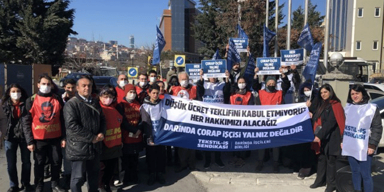 Tekstil İşçileri Sendikası’nda (Tekstil – İş Sendikası) örgütlü olan ve zam haklarını talep ettikleri için işten çıkarılan Darinda Çorap fabrika işçileri, İstanbul Beylikdüzü’nde bulunan fabrika önünde bir araya geldi.