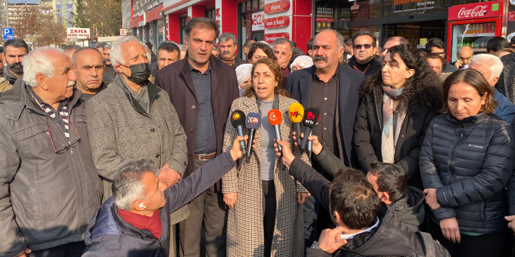 DBP Genel Merkezi ve il binalarına yönelik polis baskını ve gözaltılara ilişkin Genel Merkezi Amed İrtibat Bürosu önünde açıklama yapılıyor.