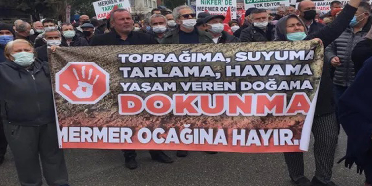 Bugün Nikfer Mahallesi’nde yapılmak istenen bilgilendirme toplantısını protesto eden halk, toplantıyı yaptırmadı. “Toprağıma, suyuma, tarlama, havama, yaşam veren doğama dokunma” pankartı açan yöre halkı “Mermer ocağı istemiyoruz” sloganı attı. Yurttaşlar tarafından firma yetkililerinin konuşmasına izin verilmezken, yetkililer toplantıdan ayrılmak zorunda kaldı.