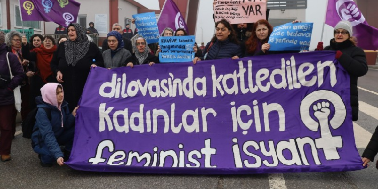 “Dilovası’nda katledilen kadınlar için feminist isyan” pankartının taşındığı açıklamada, sık sık “Kaza değil cinayet” sloganı atıldı. Halkların Eşitlik ve Demokrasi Partisi (DEM Parti) kadın milletvekillerinin de katıldığı açıklamada kadınlar adına konuşan Damla Uyar, davanın takipçisi olduklarını belirterek, “Bu iş cinayeti kadınlara reva görülen istihdam biçiminin en somut örneğidir. Yangından hemen sonra Cumhurbaşkanı, bakanlar açıklamalar paylaştı, herkes yaşananları kınadı. Yani bu katliamla ilgili esas sorumlular, denetleme yapmayanlar, çalışma ortamını, işçilerin koşullarını bilip, hatta şikayetleri alıp burayla ilgili işlem yapmayanlar, bu iş cinayetini kınamakla yetindi. Peki kınama hangi hayatı geri getirebilir? Adına iş yeri denen insanlık dışı çalışma koşullarında kadınların ve kız çocuklarının emeğinin bu denli sömürülmesinin tek sorumlusu iş yeri sahibi midir? Hiçbir önlem alınmamasına rağmen çalışan bir iş yerindeki cinayetin sorumlusu iş güvenliği uzmanı mıdır? Öyle bir işyeri neden ve nasıl var olabilir? Ölen kadın ve kız çocuklarının yaşlarına baktığımızda istihdamın en güvencesiz kesimlerini görüyoruz. Türkiye’de kadın istihdamı yüzde 31 iken, bu oran tam zamanlı ve kayıtlı olarak daraltıldığında yüzde 19’lara iniyor. İstihdam edilebilen kadınlar ise ancak asgari ücret ve civarına razı olmak zorunda kalıyorlar. Çoğu asgari ücrete veya sigortaya dahi erişemiyor” diye belirtti.
