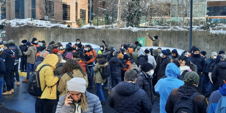 Trendyol Group firmasının yaptığı yüzde 11’lik zamma karşı iş bırakma eylemiyle seslerini duyuran Trendyol Express çalışanları, şirketin Maslak’taki Genel Merkez Binası önünde toplandı.