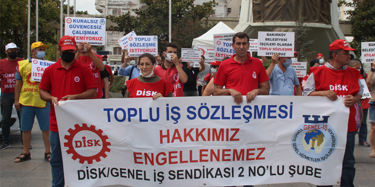 Doğan, “Bakırköy Belediye yönetimi 2018 Nisan ayından bu yana şirket değişikliğine gitmiş ve bu değişikliğine karşı sendikamız DİSK Genel-İş, her durumda Çalışma Bakanlığı’ndan yetki tespiti almıştır. Alınan yetki tespitlerine her defasında itirazını sürdüren belediye yönetimi, geçen 3 yılda tüm girişimlerimize rağmen toplu sözleşme yapmamak için mahkeme eliyle süreci uzatmıştır ve süreci uzatmaya devam etmektedir” diye konuştu.