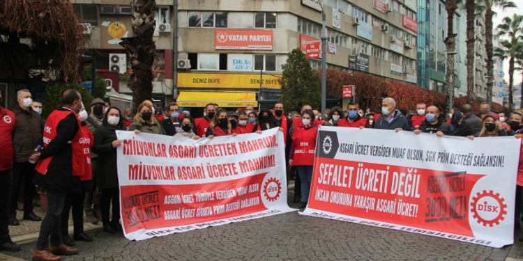 DİSK Ege Bölge Temsilciliği, Konak ilçesinde bulunan eski Sümerbank önünde açıklama yaptı. Açıklamada sık sık “Hükümet istifa” ve “AKP zammını al başına çal” sloganları atıldı. DİSK Ege bölge Temsilcisi Memiş Sarı, emekçilerin, bu asgari ücreti reva görenlerden sandıkta hesap soracağını belirterek, şunları söyledi: “Emekliler, işsizler, kadınlar ve işçiler olarak hesap soracağız. Asgari ücretle bizim yaşamlarımızı açlık sefalet yoksulluğa ittikleri için hesap soracağız. Korkuyorlar bizden korkuyorlar sokaklardan. Asgari ücreti düşük tutmalarının sebebi Çalışma Bakanının almış olduğu eğitimdir. Aldığı eğitim çoklu yoksullaştırma programı. Yani Türkiye’de bütün insanları yoksulluk içinde bir programa dahil ederek çoklu yoksullaştırma programını hayata asgari ücretle geçirmeye çalışıyorlar. Biz bu yapılanları unutmayacağız ve sandıkta hesap soracağız.”