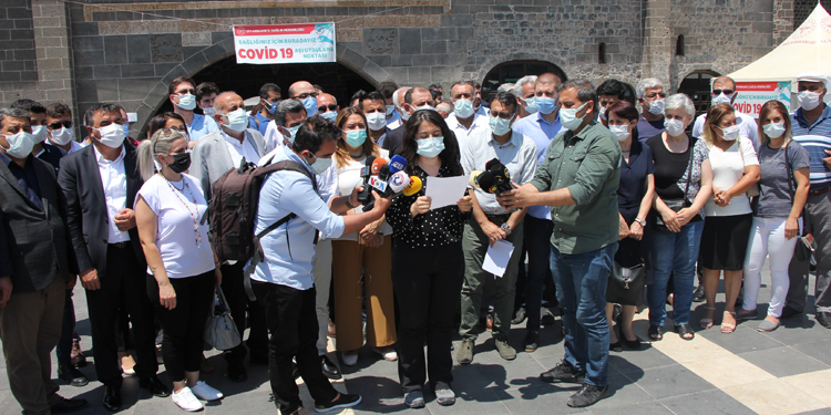 Açıklamanın Kürtçesini Sağlık ve Sosyal Hizmet Emekçileri Sendikası (SES) Şube Eşbaşkanı Şiyar Güldiken, Türkçesini ise Diyarbakır Tabip Odası Başkanı Elif Turan okudu.