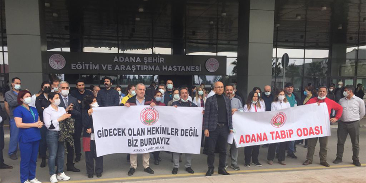 Adana Tabip Odası da Adana Şehir Hastanesi önünde yaptığı açıklama ile Erdoğan’a tepki gösterdi. Açıklamada konuşan Adana Tabip Odası Başkanı Dr. Selahattin Menteş, hekimlik mesleğinin son yirmi yılda olmadığı kadar değersizleştirilip, artık bu durumun katlanılamaz duruma geldiğini belirterek, “Bizler ülkenin yöneticilerinde çözüm bekler iken karşılaştığımız muamele bizleri utandırmış ve kırmıştır. İsteklerimiz çok basittir. Emekliliğe de yansıyacak temel ücret istiyoruz. 7200 ek gösterge ve her yıla 120 gün yıpranma payı istiyoruz. Etkin ve uygulanabilir sağlıkta şiddet yasası istiyoruz. Güvenli ve sağlıklı çalışma alanları istiyoruz. 5 dakikada muayene olmaz diyoruz. Covid19 meslek hastalığı olsun istiyoruz. Biz bunları isterken siz bize kapıyı gösteriyorsunuz. Bu ülkenin hekimleri kalacak ama hekimlerin sıkıntılarını çözmeyen siyasiler mutlaka gidecek. Bu topraklarda iyi hekimlik sonsuza kadar var olacaktır” dedi.