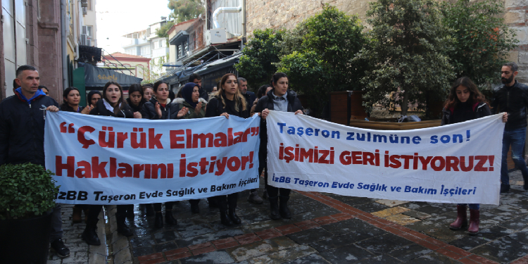– İzmir Büyükşehir Belediye (İZBB) bünyesinde taşeron bir şirkette çalışan 31 Toplum Sağlığı ve Evde Bakım işçisinin işine 21 Temmuz’da son verildi. Yaklaşık 5 aydır farklı eylem ve etkinliklerle direnişte olan işçilerden sadece 5’i işine geri dönebildi. Tüm işçilerin geri alınacağı sözünü veren Belediye Başkanı Tunç Soyer’e karşı işçilerin eylemi farklı biçimlerde sürüyor.