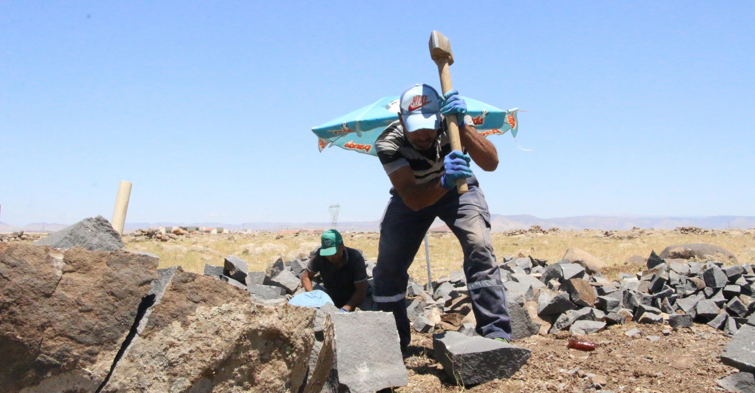 Şırnak’ın İdil ilçesinin Turgut Özal Mahallesi’ne bağlı olan baraj yolu mevkiindeki boş arazilerden çıkarılan bazalt taşlar, ustaların elinde şekilleniyor. 35 dereceyi bulan sıcaklığın altında çalışan ustalar, taşları balyoz ve çekiç yardımıyla yontuyor. Büyük emeklerle şekillenen taşlar, tarihi mekanların restorasyonunda, park, bahçe ve kaldırım yapımında kullanılıyor. Ağır şartlarda çalışan ustaların günlük yevmiyesi ise 160 TL.