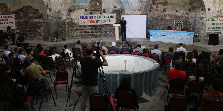 Mezopotamya Ekoloji Hareketi ve Türkiye Mimarlar ve Mühendisler Odası Birliği (TMMOB) Diyarbakır İl Koordinasyonu Kurulu’nun “Yok etmeye karşı mücadele ve yeniden inşa yolları” şiarıyla Sur ilçesinde bulunan Deva Hamamı’nda “Ekoloji ve toplumsal yıkım kıskacında yaşam buluşması” etkinliği düzenledi. Forum, panel ve seminerler şeklinde tasarlanan buluşmanın yapıldığı hamama “Tekoşîna civaka ekolojîk tekoşîna kesî ye”, “Li dijî faşizmê em bibin daristan”, “Xweza çavkaniya jiyanê ye biparêze!”, “Tarihine ve doğasına sahip çıkmayalar geleceği belirleyemez” pankartları asıldı.