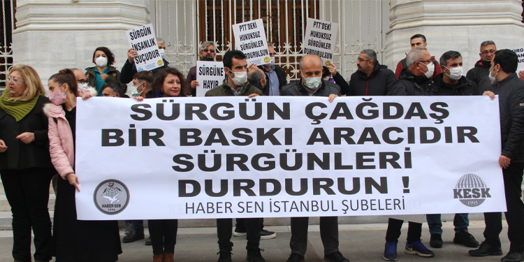Basın Yayın İletişim ve Posta Emekçileri Sendikası (HABER-SEN) İstanbul Şubeleri, sendikalarına üye PTT çalışanlarının başka bölgelere gönderilmesini Sirkeci’de bulunan PTT Baş Müdürlüğü önünde yaptıkları açıklamayla protesto etti. Açıklamada, “Sürgün çağdaş bir baskı aracıdır” pankartı açılırken, sık sık, “Baskılar bizi yıldıramaz” sloganı atıldı. HABER-SEN Genel merkez yöneticisi Banu Savaş, PTT yönetiminin salgını bahane ederek keyfi uygulamalarla, çalışanlara mobing uyguladığını söyledi. Savaş, PTT’de yandaş sendikaların yöneticilerinin yönetime sınavsız geldiğini kaydetti. Savaş, “PTT’de son 8 yıldır görevde yükselme sınavı yapılmamaktadır. Bunun yerine kurum dışından PTT’nin işleyişini bilmeyen, kurum kültürüyle yetişmemiş, yetersiz kişilerin yanı sıra; yandaş sendikaların yöneticileri liyakatsiz biçimde kuruma üst düzey yönetici olarak atanmaktadır” dedi.
