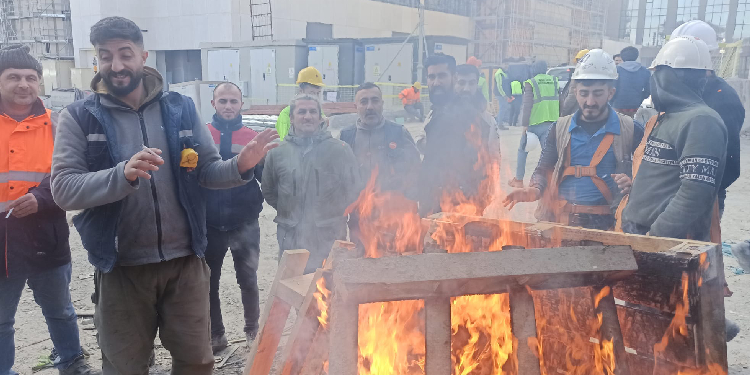 Limak Holding’in Ataşehir’de bulunan şantiyesinde ücretlerini alamadıkları için iş bırakan işçiler, yaktıkları Newroz ateşi etrafında slogan atarak direnişi sürdürüyor.
