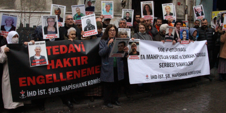 İnsan Hakları Derneği (İHD) İstanbul Şubesi Hapishaneler Komisyonu, hasta tutukluların durumuna dikkat çekmek amacıyla her hafta düzenledikleri “F Oturumu” eyleminin 566’ncısını dernek binası önünde gerçekleştirdi. Açıklamaya birçok insan hakları savunucusu ve hasta tutulu yakınları katıldı. Hasta tutukluların fotoğraflarının taşındığı açıklamada, “Tedavi haktır engellenemez” ve “Hasta mahpuslar Fırat ve Emrah Nebioğlu serbest bırakılsın” pankartı taşınırken, sık sık “Hasta tutuklular serbest bırakılsın” ve “Tedavi haktır engellenemez” sloganları atıldı. Bu haftaki eylemde Diyarbakır T Tipi Yüksek Güvenlikli Cezaevi’nde bulunan hasta ve engelli tutuklu Fırat Nebioğlu ile Antalya S Tipi Kapalı Cezaevi’nde bulunan hasta ve engelli tutuklu Emrah Nebioğlu kardeşlerin durumuna dikkat çekildi.