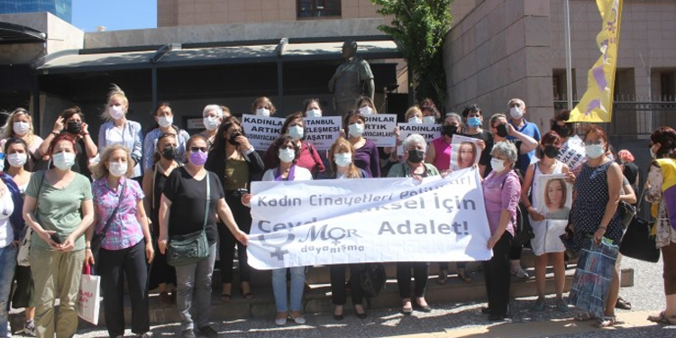 Duruşma öncesi İzmir Kadın Meclisleri ile Mor Dayanışma ve Karabağlar Kent Konseyi Kadın Meclisi Şiddetle Mücadele Grubu adliye önünde iki ayrı basın açıklaması düzenledi.