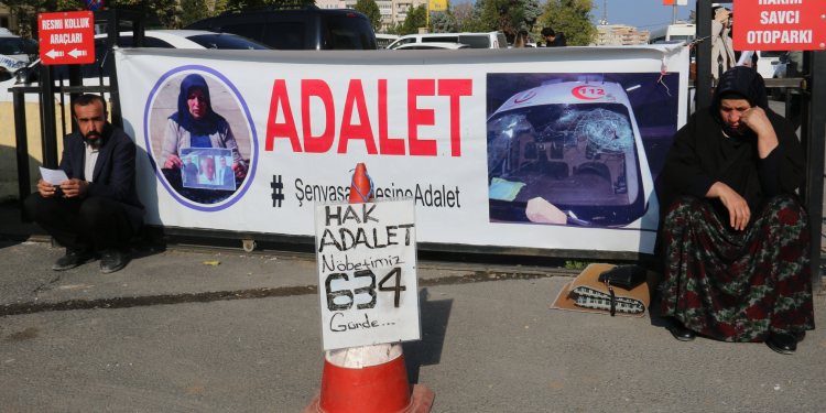Riha’nın Pirsûs (Suruç) ilçesinde 14 Haziran 2018 tarihinde AKP Milletvekili İbrahim Halil Yıldız’ın koruma ve yakınları tarafından eşi ve iki oğlu katledilen Emine Şenyaşar ile saldırılardan yaralı kurtulan oğlu Ferit Şenyaşar’ın, Urfa Adliyesi önünde 9 Mart 2021’de başlattığı Adalet Nöbeti eylemi 634’üncü gününde. Aile, Pirsûs ilçesindeki evlerinden gelerek, adliye önünde nöbet eylemine başladı.