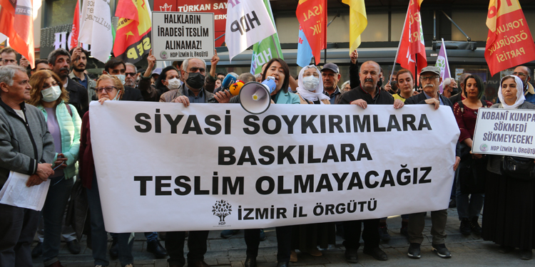 HDP İzmir İl Örgütü, Kobanê dosyasının yeniden açılarak parti üye ve yöneticilerine yönelik yasana gözaltılara karşı Alsancak Türkan Saylan Kültür Merkezi önünde basın açıklaması yaptı. “Siyasi soykırımla, baskılara teslim olmayacağız” pankartının açıldığı açıklamada “Kobanê kumpası sökmedi, sökmeyecek” ve “Hakların iradesi teslim alınamaz” dövizleri taşındı. Sık sık “HDP halktır halk burada”, “Baskılar bizi yıldıramaz” ve “Birleşe birleşe kazanacağız” sloganları atılan açıklamaya kentte bulunan siyasi parti ve sendikalarda destek verdi.