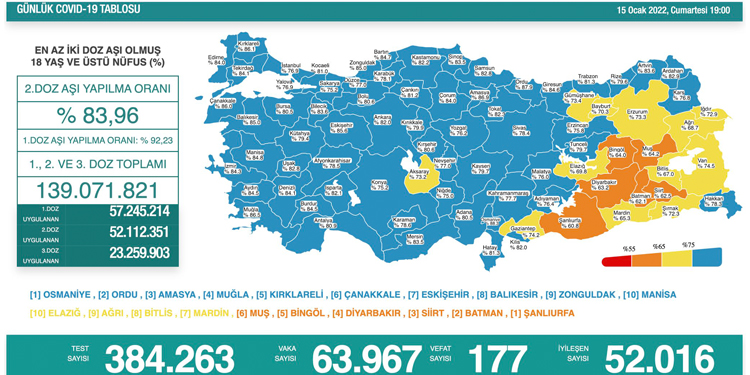 Sağlık Bakanı Fahrettin Koca’nın sosyal medya hesabından yaptığı paylaşımda bugüne ait koronavirüs tablosunu paylaştı. 63 bin 967 kişinin testi pozitif çıkarken, 177 kişi hayatını kaybetti. Ayrıca son 24 saatte 384 bin 263 Kovid-19 testi yapıldı.