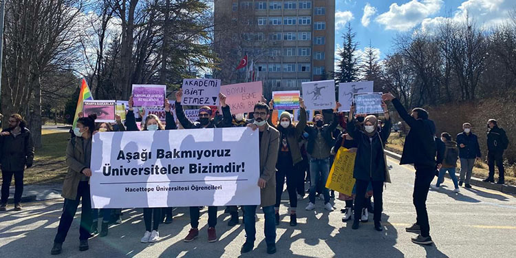 Hacettepe Üniversitesi öğrencileri, Boğaziçi Üniversitesi’ne Melih Bulu’nun rektör olarak atanmasıyla başlayan “Kayyım rektör” protestolarına destek vermek için Hacettepe Üniversitesi’nde basın açıklaması yaptı. Açıklamada, “Aşağı Bakmıyoruz Üniversiteler Bizimdir!” pankartı açıldı.